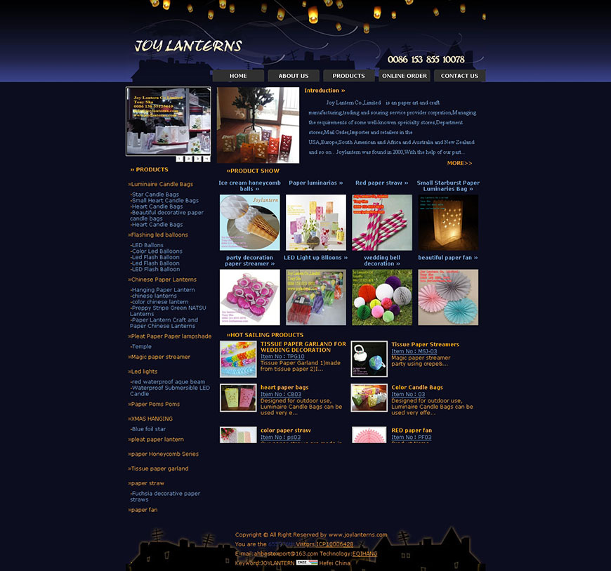 Joy Lantern Co.,Limited  is an paper art and craft manufacturing,trading and souring service provider corpration,Managing the requirements of some well-knowen speicialty stores,Department stores,Mail Order,Importer and retailers in the USA,Europe,South American and Africa and Australia and New Zealand and so on .