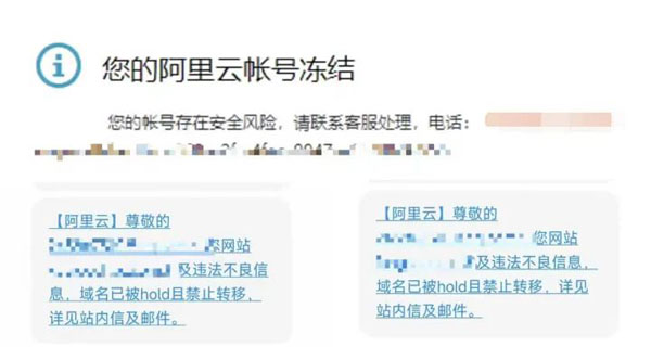 某網友爆料:一個站長有60多個客戶站,說沒就沒了,損失慘重。60個域名,全部被禁止解析和轉移、而且阿里云帳號被凍結,其中一個域名指向網站涉詐。