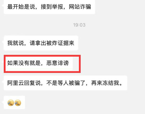 同時該站長還建議:如果大家的賬號中有涉及到某些方面的網站,只要有一丟丟的違規,就轉移一下吧,以火箭的速度轉移……如果阿里云拿不出涉詐的證據出來,就是惡意誹謗,而阿里云的回復則說,不是等人被騙了,再來凍結網站。
