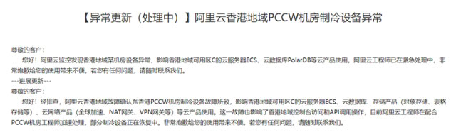 阿里云香港某機房設備異常,大面積停擺24小時