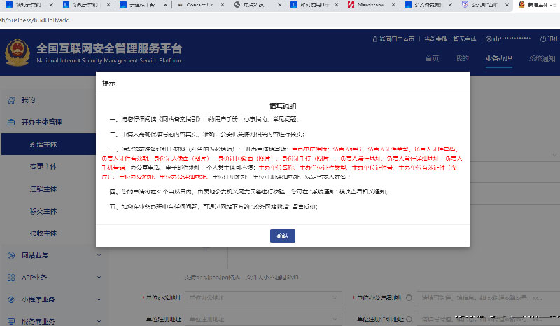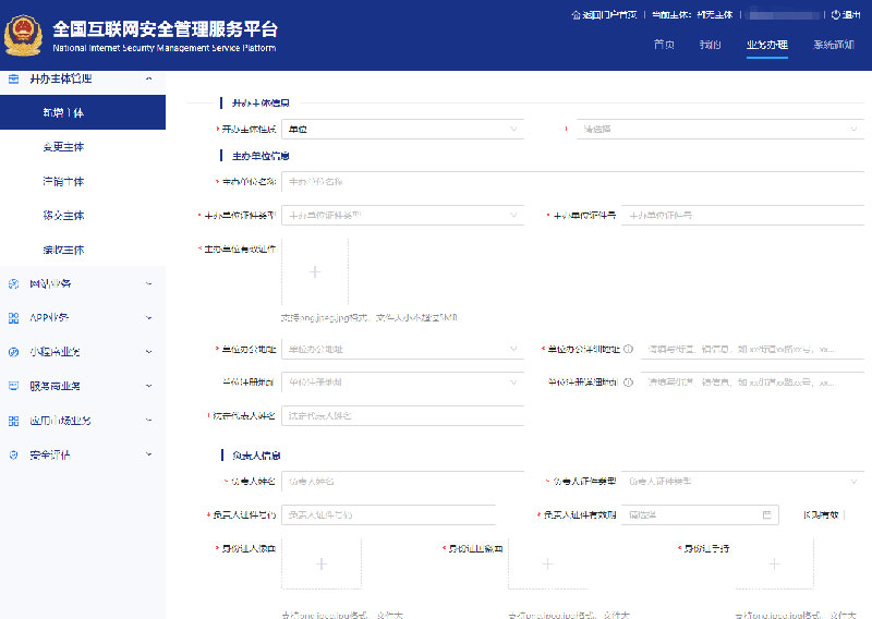 申報流程:新增主體——主體審核通過以后點擊新辦網站申請,按照順序填寫資料。