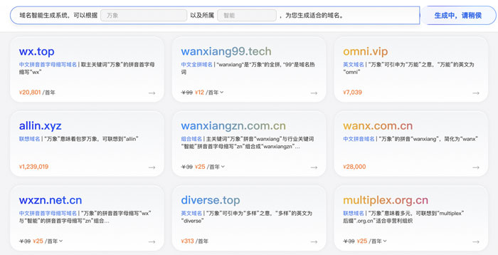升級后的阿里云萬網,用戶只需輸入品牌名稱和所屬行業,基于通義大模型就能批量生成創意域名,并自動完成可用性篩查,輸出域名含義。隨著域名注冊量的增長,簡短易記的域名變得難以獲得,據統計,找到一個滿意的域名平均需要查詢50次以上,而智能起名應用則能一鍵完成這一過程,使域名注冊從“拼腦力”進入“拼算力”時代。