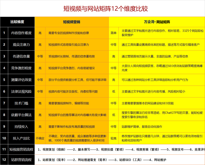 其次,我們從12個維度來比較短視頻和網站矩陣的優劣勢